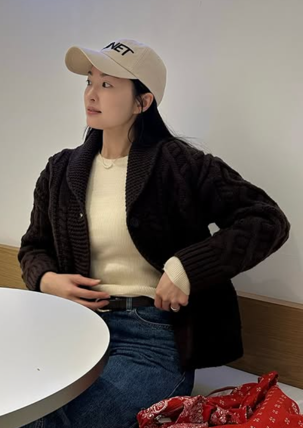 브라운 니트 가디건은 고급스러운 클래식함을 더해줘서 전체적인 룩에 우아함을 더했어요. 크림색 니트와의 조화가 정말 멋졌죠!