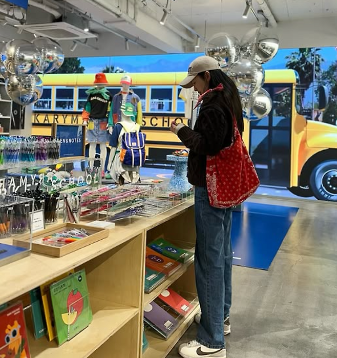가방은 페이즐리 패턴의 레드 색상으로 포인트 있는 에코백을 들어 스타일의 무드를 더했죠.
