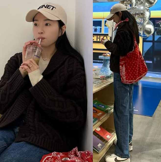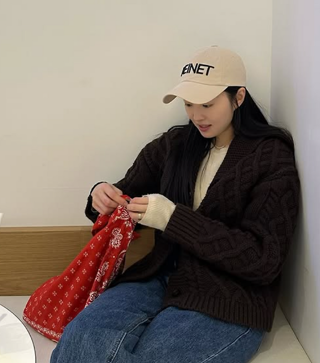 류이서 님은 클래식한 브라운 꽈배기 가디건에 크림색 니트를 레이어드 했는데요. 하의는 청바지에 벨트를 매치해서 스타일링했더라구요. 모자는 베이지 색상의 볼캡으로 캐주얼한 포인트를 더했어요.