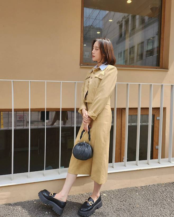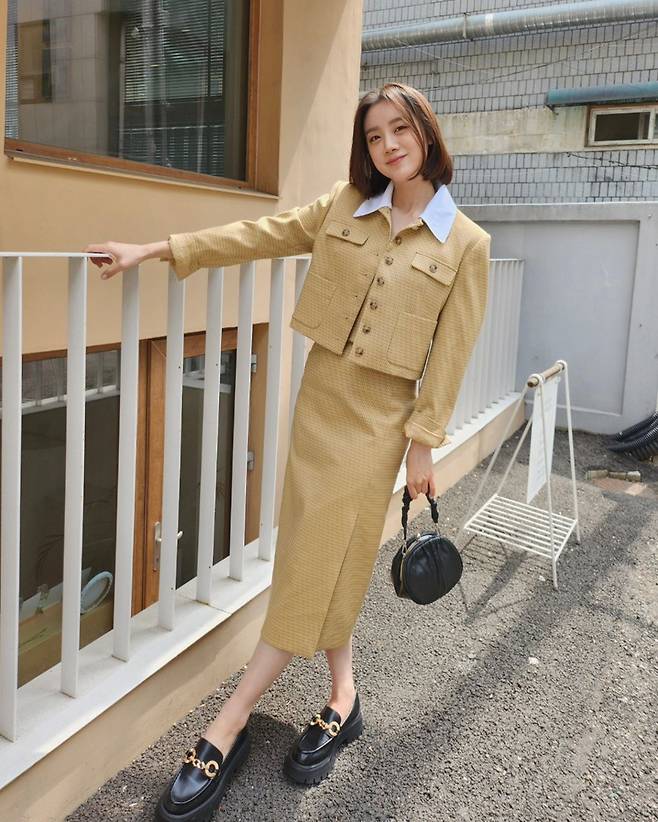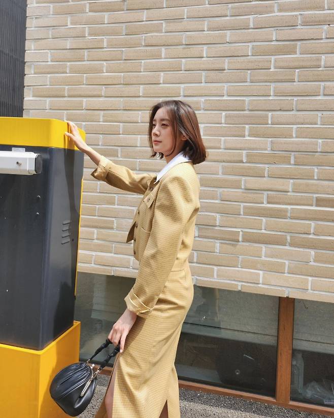 사진 속 우혜림은 흰 카라가 포인트인 노란 잔 체크 크롭 자켓과 셋업인 롱치마를 입고 블랙구두를 신어 페미닌룩을 선보였다.