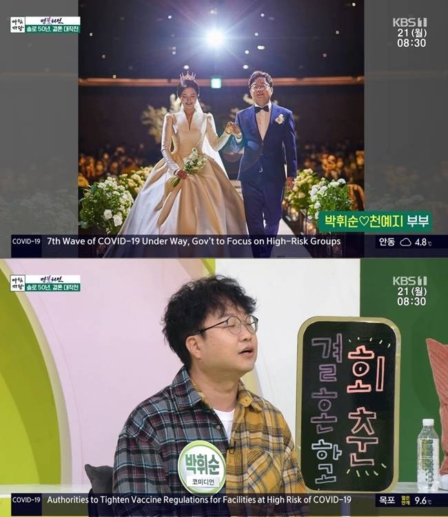 김솔희 아나운서는 "이 분의 결혼 소식을 듣고 지상렬 씨가 일주일 배가 아팠다고 한다. 17살 연하 신부를 만난 분이다"며 박휘순을 소개했다.