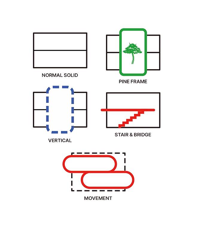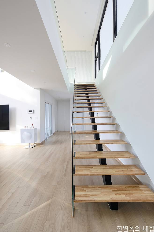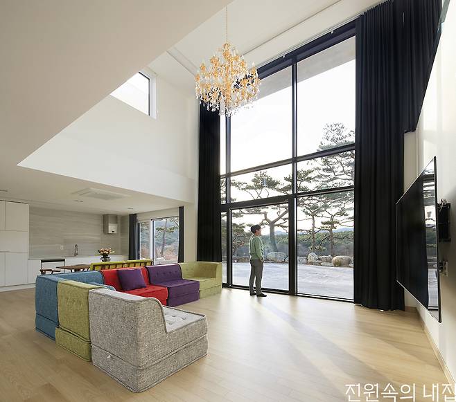 한편, 주택의 동서남북으로 각기 다른 풍경이 펼쳐지는 상황에서 동선을 긴 계단이나 브릿지로 의도적으로 길게 흐르도록 해 주변 환경과 건축이 얽히며 공간을 채워나가도록 의도했다. 여기에 더해 특정한 물건(오브제)이 아닌, 실내로 들이치는 빛으로 시간의 흐름에 따라 분위기가 바뀔 수 있도록 개구부와 구조의 배치와 크기, 커튼의 컬러까지 고려했다.
