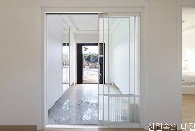 가장 적은 것으로 가장 많은 효과를 내기 위해 주택은 기본적인 ‘박스’ 형태를 띄게 되었고, 컬러 또한 ‘없음’을 완성하기 위한 화이트로 채워 넣었다. 특정 자재에서 연상되는 고유의 물성이 주택으로 옮겨오는 것을 막기 위해 마감재도 민무늬 대리석이 선택되었다.