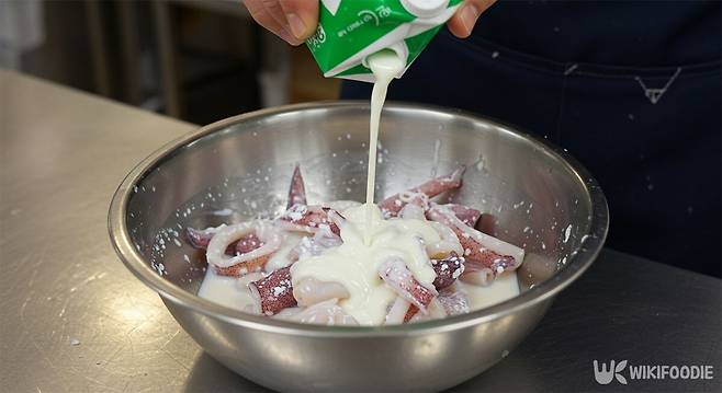 9. 손질한 오징어를 볼에 담고 우유에 5분간 담가둔다