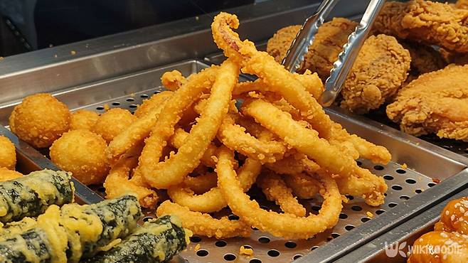 튀김 준비 단계에서는 손질한 오징어를 우유에 담가 비린내를 잡고, 체에 걸러낸 후에는 맛소금과 다시다로 밑간을 한다. 이 상태로 5분간 재운다. 이후 넓은 곳에 밀가루를 넉넉히 깔고 오징어를 묻힌 뒤 한 시간 정도 그대로 둔다. 이 과정은 오징어에 밀가루가 자연스럽게 입혀지고 수분이 흡수돼 튀김옷이 잘 붙게 한다.