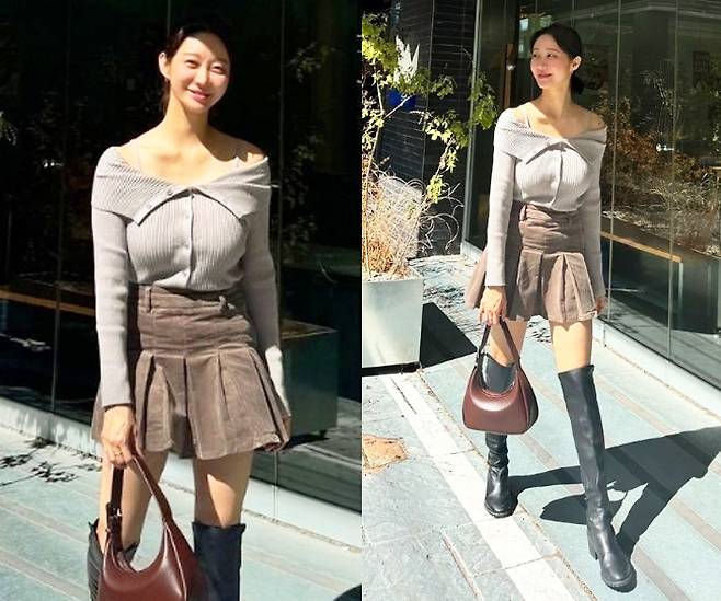 또, 한그루는 브라운 플리츠 미니스커트를 착용해 러블리하고 빈티지한 무드를 한껏 살렸습니다.