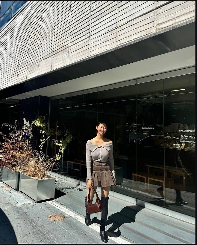 한그루는 회색 오프숄더 카디건 탑을 착용해 청초하고 페미닌한 이미지를 돋보였습니다.