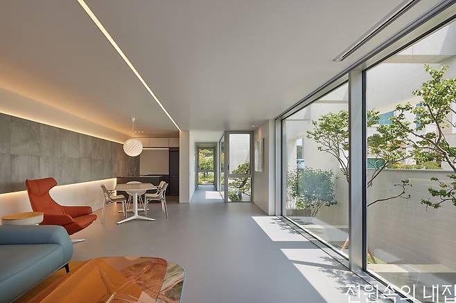 선택적으로 마당을 공유하고 외부로부터의 시선 간섭을 없애기 위해 거실 앞에는 일종의 버퍼 공간을 만들어주는 장치로 가벽을 계획했다. 이 가벽은 외부의 시선을 차단함과 동시에 빛을 의도된 방향으로 끌어들이고 실내에서 바라보면 액자처럼 수목의 배경이 된다.