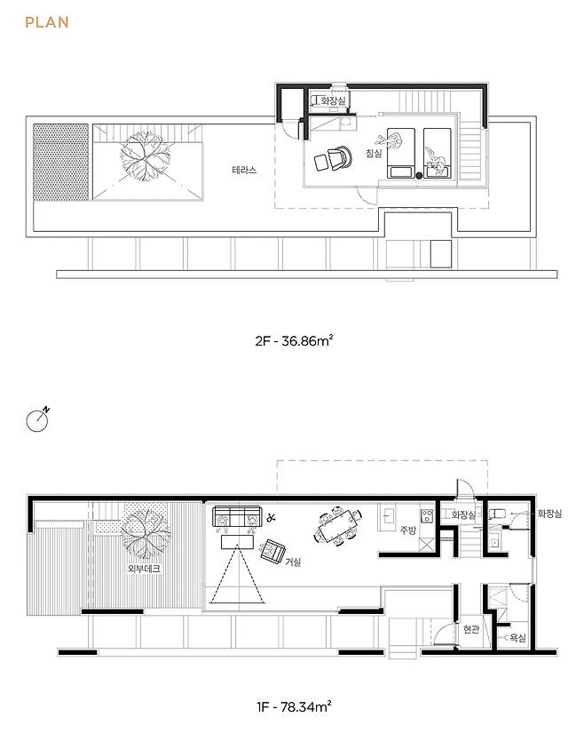 단순히 주거만을 만족시키는 집이 아니라, 누가 오더라도 일상을 잊고 휴식을 취할 수 있는 잘 가꿔진 스테이 같기를 원했다. 넓은 거실과 과하지 않은 최소한의 주방, 그리고 침실. 건축주가 원하는 방향이 명확했기에 요구하는 프로그램은 비교적 단순했다.