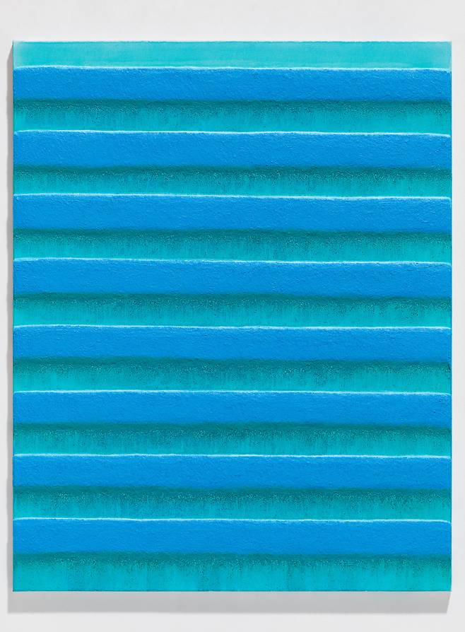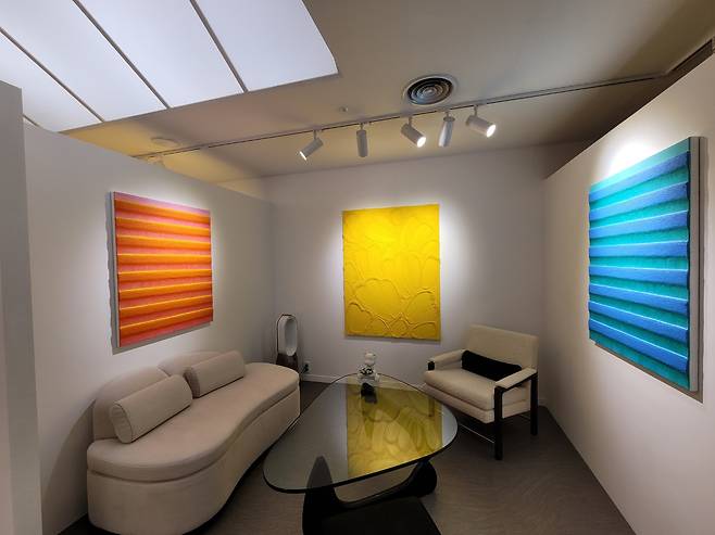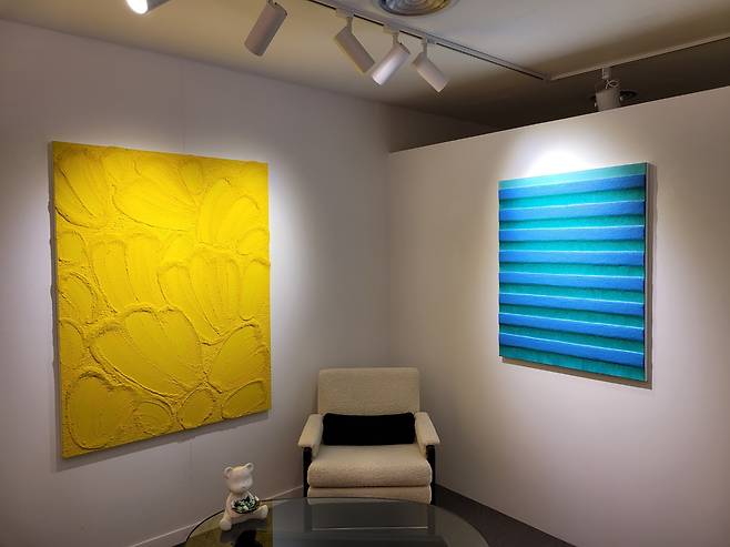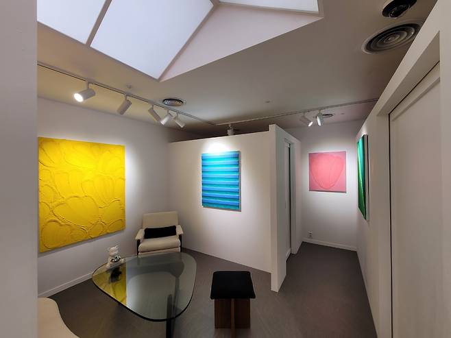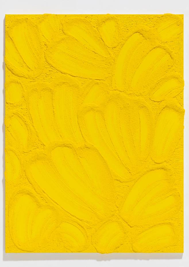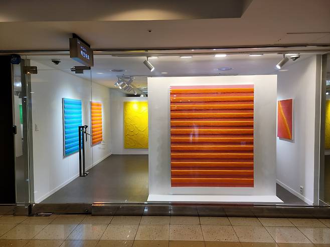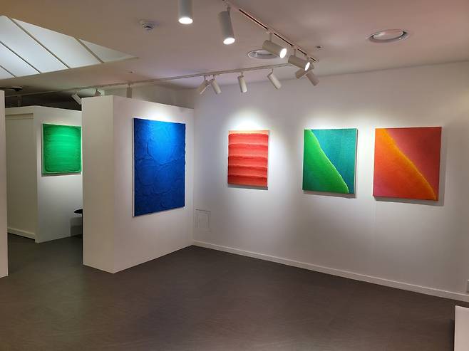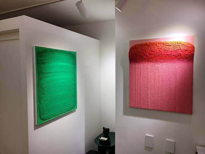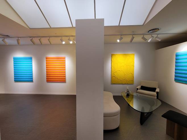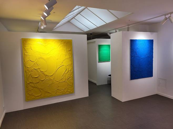 작품의 시그니쳐는 톱밥작업을 시작할 당시 ‘송화가루가 날리던 봄의 기억’을 살린 노란 작업들이다. 작가는 송화가루가 생명의 씨앗이자 자연의 시작과도 연결된다고 말한다. 작가에게 색의 확장은 변화무쌍한 자연의 순환을 의미한다. 작가는 수행하듯 탱탱한 긴장 상태를 유지하면서 투명성과 발색을 적절히 충족시키는 서너 겹의 단계를 거쳐 ‘색과 톱밥의 균형’을 캔버스에 펼쳐낸다. 행위성이 가장 잘 드러난 ‘전면 컬러페인팅 시리즈(Full Color-Field Painting Series)’는 작가의 자유로운 감각이 무계획의 계획 속에 어우러진다면, ‘세로 형상 시리즈(Vertical Painting Series)’는 정신을 집중시킨 일정한 반복 속에서 어떠한 도구도 개입되지 않는 손끝의 에너지가 창출해낸 ‘감각적 부조 추상’라고 할 수 있다.
