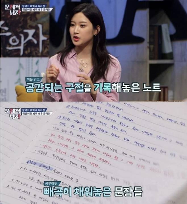 문가영이 직접 쓴 에세이 『파타(PATA)』는 2024년 3월 출간 첫날 2000부가 팔리며 중쇄에 돌입, 베스트셀러에 등극했다. 책 제목은 그녀가 만든 자아 ‘파타’에서 따온 것인데, "용기 없는 나에게 파타라는 이름을 붙였다"는 문장에서 알 수 있듯, 책 속엔 솔직하고 단단한 문가영의 모습이 담겨 있다. 단테의 『신곡』을 완독하고, 리베카 솔닛과 버지니아 울프의 글귀를 독서 노트에 옮겨 적는 진성 독서러답게, 서점 순례는 기본이고 마음에 드는 문장을 발견하면 노트에 곱게 적어 오래도록 곱씹는다. 책 속 활자 하나가 마음을 위로해 줄 때, 그 힘은 연기의 원천이 되기도 한다.