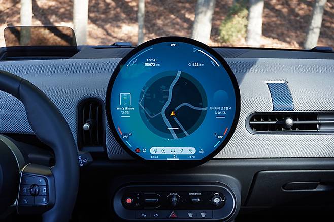 인테리어에서도 간결화가 주제다. 대시보드의 레이아웃을 간결하게 했다. 재활용 폴리에스트러의 패브릭 느낌이 나는 트림 처리도 도어와 센터 스택 등에서 고급스러움을 살리고 있다. 그 중심에 OLED 직경 240mm의 원형 센터패시아가 있다. 선대 모델은 매립형이었으나 4세대는 팝업 형태다. 삼성 디스플레이와 공동 개발한 것이다. 그 안의 그래픽도 완전히 달라졌다. 디지털 감각이 현대적 감각으로 바뀌었다.