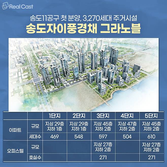 송도11공구 계획이 수도권 일대 시장의 이목을 끄는 가운데, 최초 분양 소식이 나왔습니다. ‘송도자이풍경채 그라노블’이 연초 공급을 계획하고 있죠. 공동주택용지 1·2단지와 주상복합용지 3·4·5단지를 통합개발하는 단지로, 전체 3,270세대(아파트 5개 단지 2,728세대, 오피스텔 2개 단지 542실) 규모입니다.