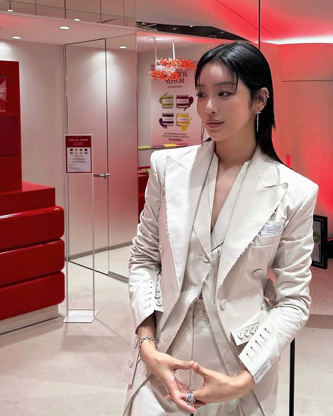 크림 화이트 컬러의 오버사이즈 블레이저로 모던하고 시크한 무드를 연출하고 있다. 미니멀한 디자인의 블레이저는 그녀의 우아한 분위기를 한층 더 돋보이게 하며, 깔끔한 실루엣으로 세련된 오피스 룩의 정석을 보여주고 있다. 단정한 헤어스타일과 절제된 액세서리로 완성도 높은 스타일링을 선보이고 있다.