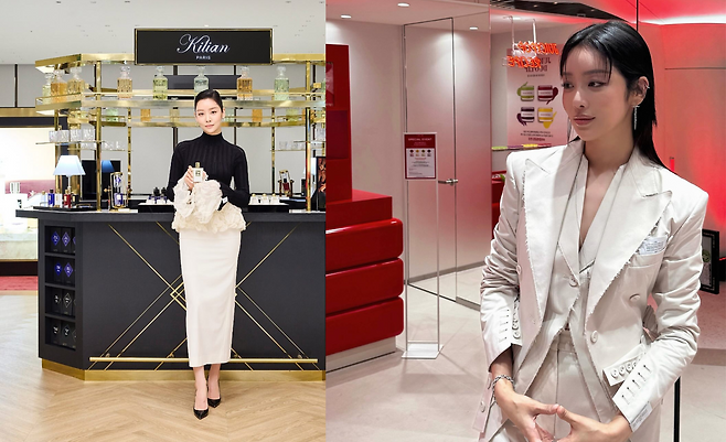블랙 터틀넥과 화이트 스커트의 조합으로 클래식한 우아함을 연출하고 있다. 하이엔드 퍼퓨머리 브랜드 매장에서 촬영된 이 룩은 모노톤 컬러의 절제된 아름다움을 보여주며, 그녀 특유의 고급스러운 이미지를 완벽하게 표현하고 있다. 미디 길이의 타이트 스커트가 우아한 실루엣을 만들어내고 있다.