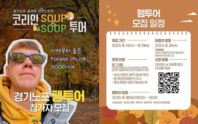 모집 대상은 만 19세 이상 경기도 거주자이며, 인스타그램·블로그·유튜브 등 SNS 운영자는 선발 과정에서 우대된다. 총 10명을 선발하며, 여행 경비는 전액 지원된다. 참가 신청은 경기관광공사 인스타그램(@gyeonggi_tour)을 통해 구글 폼으로 접수 가능하며, 당첨자는 24일 발표될 예정이다.