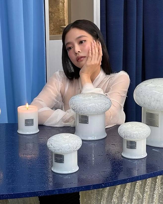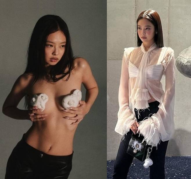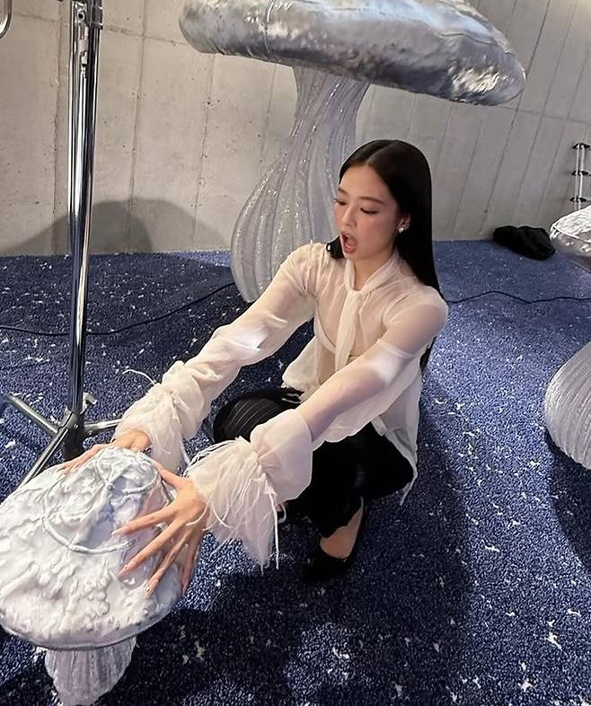 또한 제니는 거대한 버섯 형태의 조형물을 배경으로 바디 라인이 훤히 드러난 하늘하늘한 시스루 블라우스와 블랙 팬츠를 매치한 파격적인 스타일링으로 감각적인 비주얼을 완성했다.