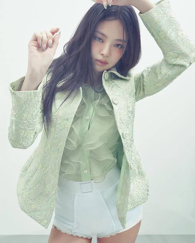공개된 사진 속 제니는 연두색 재킷과 마이크로 쇼츠를 매치한 몽환적인 눈빛의 쇼츠 슈트룩으로 시선을 사로잡았다.