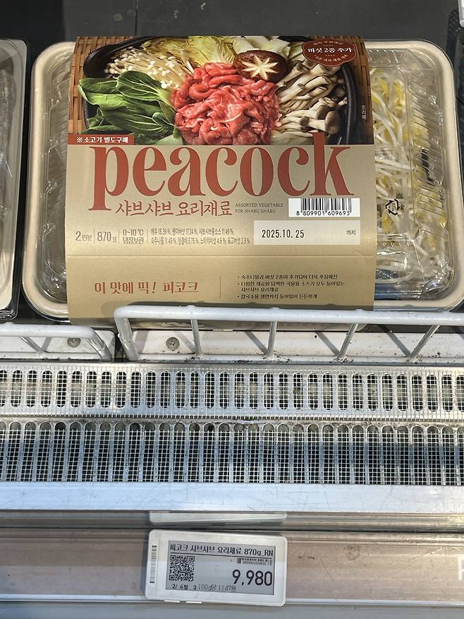 피코크 ‘이꼬이 스키나베’는 다시마 베이스의 깔끔한 육수에 소고기, 모두부, 채소와 우동사리까지 풍성하게 담긴 1,190 g 밀키트예요.