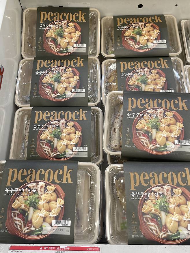 피코크 유부주머니전골는 유부주머니 안에 다양한 속재료가 들어 있고 얼큰한 육수와 함께 끓여 먹는 간편 전골형 밀키트예요.