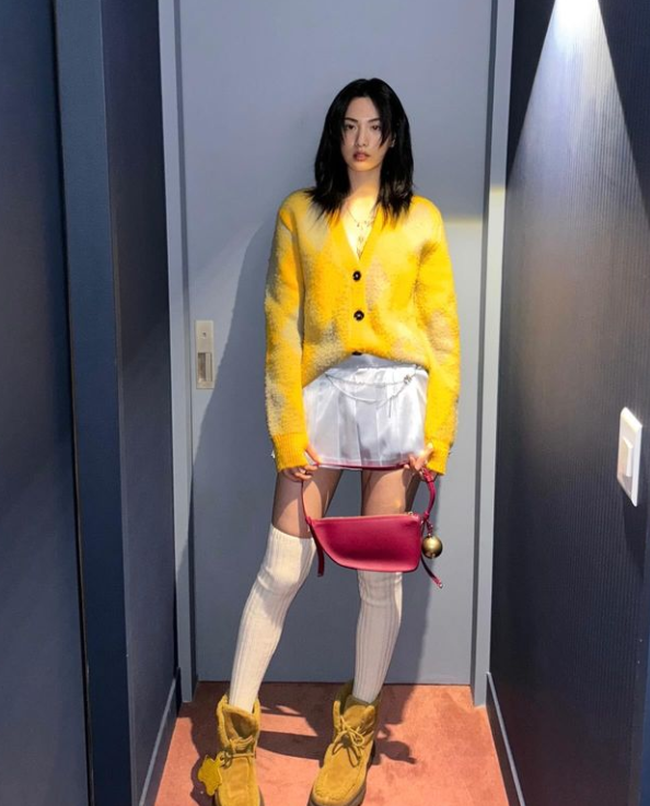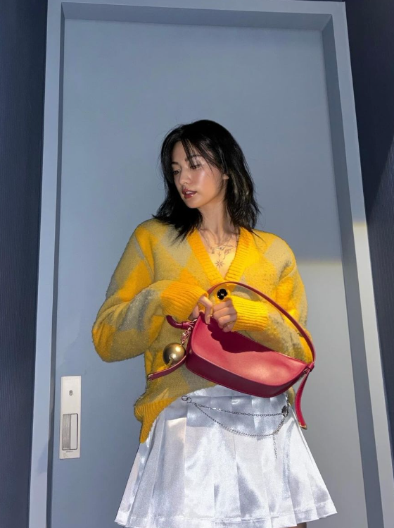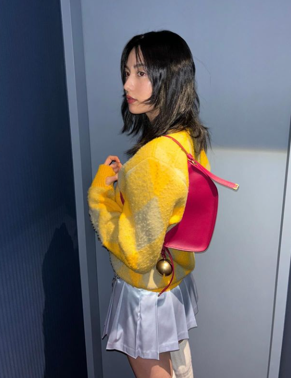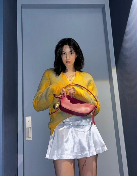 나나는 레이어드 단발 컷에 박시한 가디건을 입고 미니백을 매치해 눈길을 끌었다.