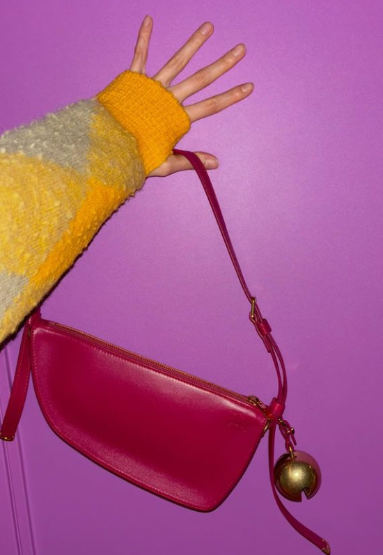 나나가 착용한 미니백은 방패 모양을 모티브로 제작된 실루엣이 특징인 숄더백이다.