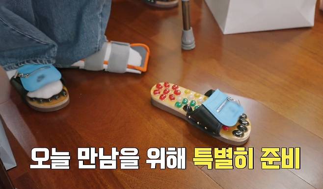 만나기 전부터 설레이는 모습을 보여줬는데 직접 커스텀한 지압 슬리퍼를