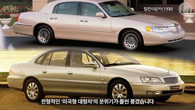 측면에서는 링컨 '타운카' 같은 전형적인 미국형 대형차의 분위기가 물씬 풍겼습니다. 낮게 가라앉은 긴 차체, 무려 5.2m에 달하는 전장은 리무진 모델을 빼면 동급에서 가장 긴 수치로, 덩치면에서도 경쟁차에 밀리지 않았죠.