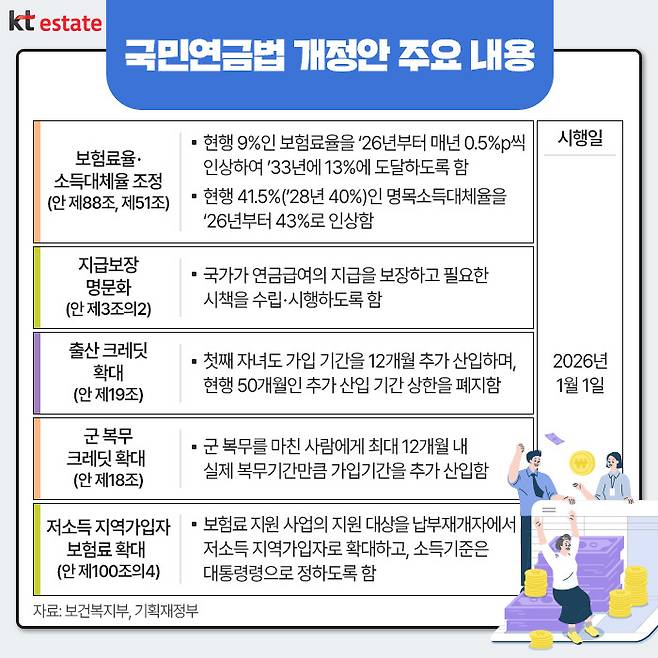 또한, 국민연금 제도에 대한 국민 신뢰를 제고하기 위해 지급 보장을 명문화했습니다. 현행법에서 둘째 자녀부터 인정되는 출산 크레딧을 첫째 자녀부터 지원토록 했으며, 군복무 크레딧 역시 현재 6개월의 인정 기간을 최대 12월로 확대했습니다. 이 외에도 보험료 인상에 따른 저소득 지역가입자의 부담을 완화하기 위해 지원 대상도 확대했습니다.