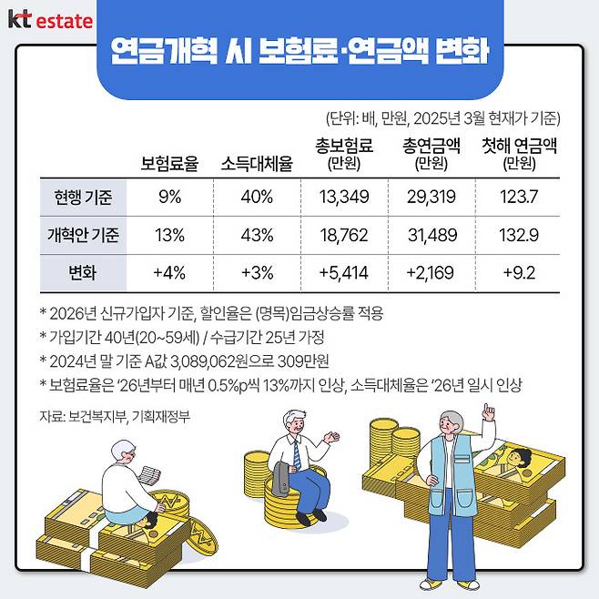 개정된 국민연금법은 하위법령 마련 등을 거쳐 2026년 1월 1일부터 시행될 예정입니다. 그렇다면 국민연금 개혁안에 따른 월 보험료와 수급액은 어떻게 달라지게 될까요?