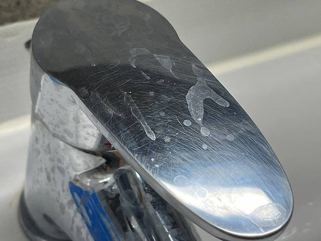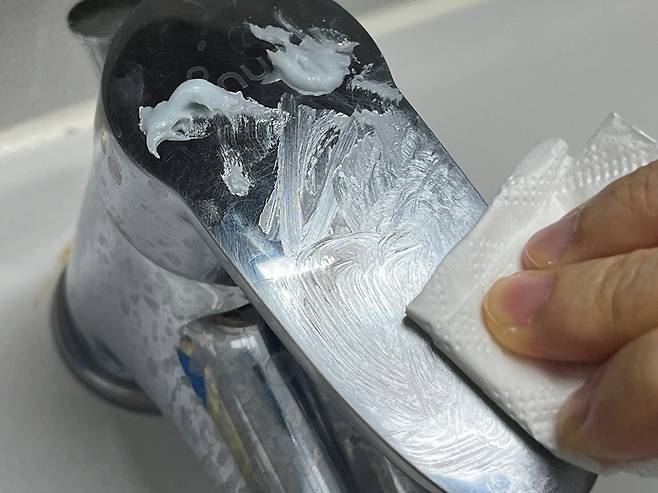 치약, 바셀린 섞은 것을 칫솔 등에 소량 묻혀 세면대 수전에 발라 보세요. 많이 바를 필요는 없고 소량이면 충분합니다.