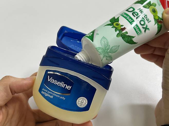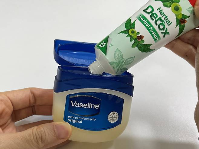 바셀린 1 : 치약 2 정도 비율로 섞어줍니다.