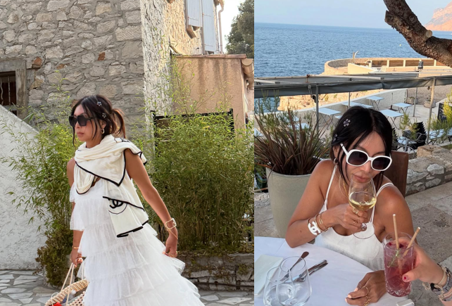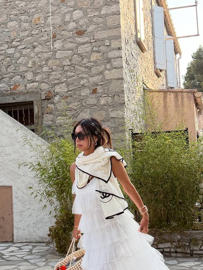 레이어드된 화이트 드레스 위에는 블랙 파이핑 포인트가 돋보이는 샤넬 스카프를 걸쳐 감각적인 리조트 룩을 완성했다.