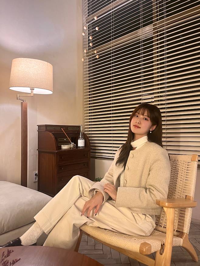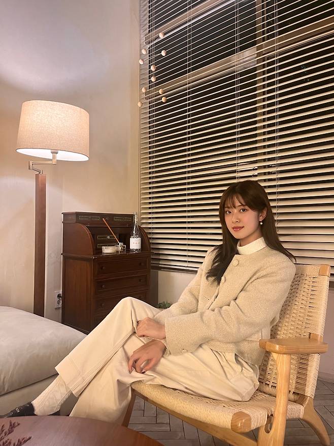 블레이저와 하의는 따듯한 오트밀 색감의 제품이고 이너는 새하얀 화이트에요.