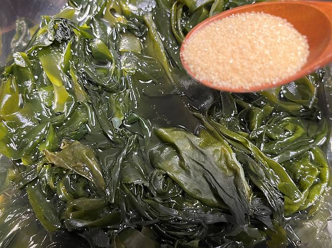 미역 불릴 때, 설탕 작은 스푼으로 1개만 넣어 보세요. 설탕을 넣으면 삼투압 작용으로 인해 미역 조직 사이사이의 불순물과 비린내가 빠르게 배출됩니다. 끓이기 전부터 미역의 잡내를 잡아주는 역할을 합니다.