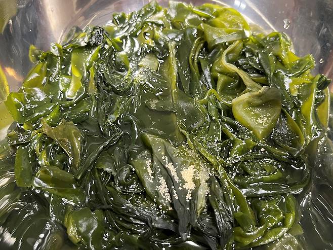 이렇게 설탕 넣고 5~10분 불린 미역은 찬물에 1~2회 헹궈 주세요. 이 과정은 미역 겉면에 남은 당분을 제거할 뿐만 아니라, 설탕물과 함께 빠져나온 비린내와 불순물을 깨끗하게 씻어내는 역할을 합니다.