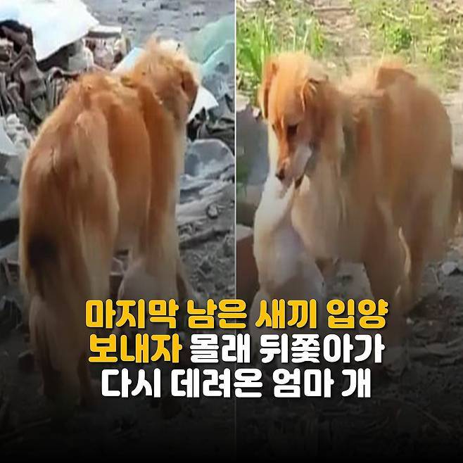 강아지가 입에 이제 막 눈을 뜬 조그만 새끼 강아지를 조심스럽게 물고 돌아온 것이 아니겠습니까. 알고 보니 이 골든 리트리버는 버려진 폐가에서 홀로 새끼들을 키우고 있던 엄마였던 것.