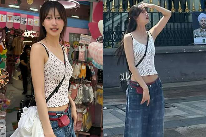 이미주는 잔잔한 패턴이 눈에 띄는 화이트 슬립에 와이드진을 매치했고, 허리에 붉은색의 벨트 백으로 포인트를 줘 눈길을 끌었습니다.