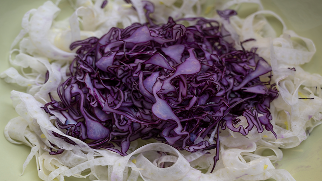 이후 채 썬 생양배추 한 줌을 준비한다. 여기에 올리브유 1스푼과 레몬즙을 더해 간단히 섞는다.