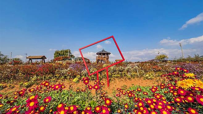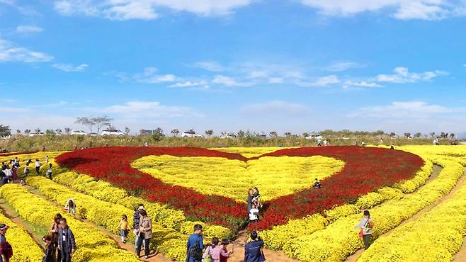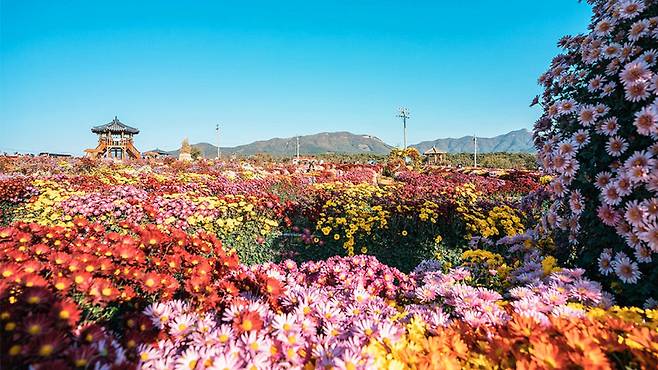 한반도 모양으로 꾸며진 국화 정원, 사랑이 피어나는 대형 하트 조형물, 달팽이 전망대에서 내려다보는 꽃물결, 동물 모양 토피어리가 가득한 광장, 그리고 눈부신 꽃탑까지!