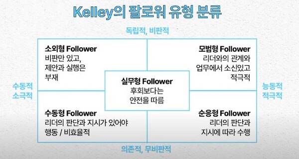 그는 Kelley가 분류한 5가지의 팔로워 유형을 제시했는데, 그 중 실제로 조직에서 요구되는 건 ‘모범형 팔로워’라고 말했다. 독립적이고 비판적이면서, 능동적이고 적극적인, 쉽게 말하면 부하라기보다는 리더의 파트너 격인 팔로워이다. 상술했듯이 팔로워는 시키는 것만 잘하는 역할이 아닌, 리더와 동등한 위치에서 조직에 기여해야 한다.