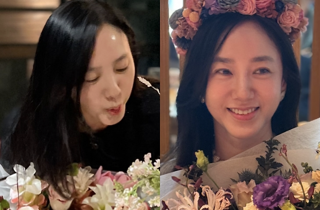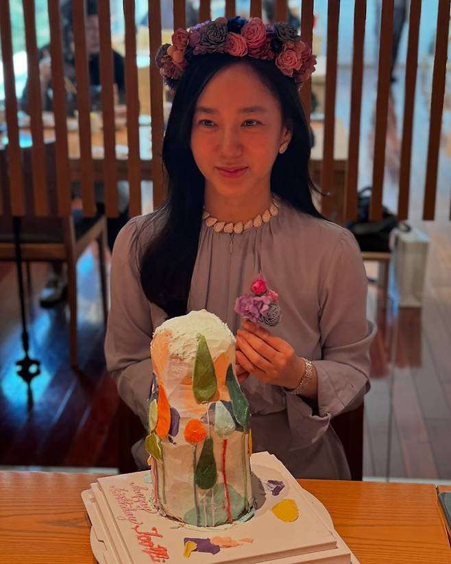 배우 박주미는 쉬폰 블라우스에 스커트를 입고 머리에는 화관을 쓴 채 아름다운 미모를 뽐내고 있습니다.