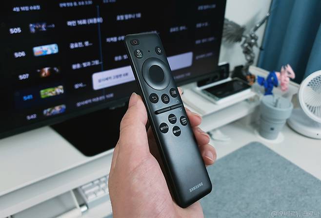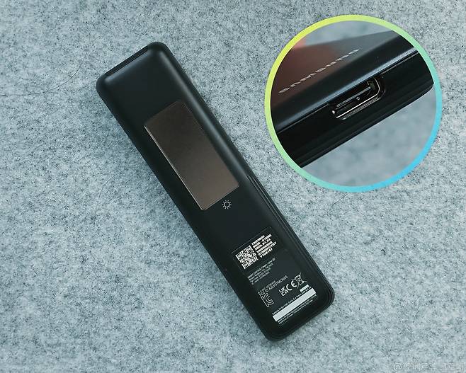 해당 모델은 스마트 허브가 탑재되어, 원활한 사용을 위해 리모컨이 기본 제공되는데요. 버튼 구성은 볼륨 및 채널 변경, 방향 키 등 가벼운 조작에 필요한 대부분의 버튼을 갖추고 있고, 짧게 또는 길게 눌러 부가적인 기능을 실행할 수 있습니다. 아래로는 핫키를 두어, 삼성 TV PLUS와 넷플릭스, 유튜브, 프라임 비디오와 같이 영상 컨텐츠를 감상할 수 있는 앱에 빠르게 접근할 수 있게끔 꾸몄고요. 리모컨은 태양전지를 통해, 실내광으로 충전할 수 있고, C 타입의 USB 충전기로 충전하는 것도 가능합니다.