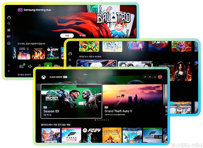 게이밍 허브에서는 Microsoft의 엑스박스 클라우드 게이밍, NVIDIA 지포스 나우 등 클라우드 게이밍 서비스를 연동해 즐길 수 있고, 관련 영상 컨텐츠를 제공해, 최신 게임과 인기 게임 등의 정보를 함께 제공받을 수 있도록 꾸몄습니다.