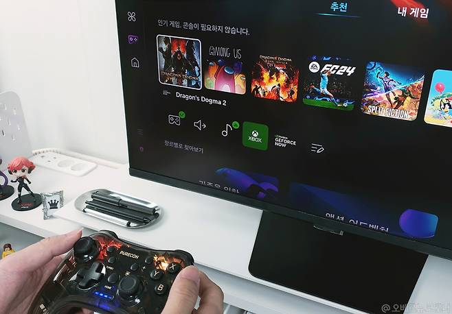 클라우드 게이밍의 경우, 구독 서비스를 이용하는 만큼, 게임을 직접 구매하거나 설치할 필요 없고, PC를 켜지 않고도 가볍게 즐길 수 있는데요. 특히, 삼성 오디세이 G7의 경우에는, 게이밍 허브를 통한 AI 업스케일링을 지원하기 때문에, 고사양의 클라우드 게임을 차별화된 퀄리티로 즐길 수 있는 게 특징입니다. 특히, 콘솔 게임기와 마찬가지로, 컨트롤러나 음향 기기 연결을 지원하는 만큼, 각 장치를 수월하게 제어할 수 있는데요. 게임 내 사운드를 즐기면서도, 즐겨 듣는 음악을 함께 청취할 수 있도록, 음악 플레이어 항목을 별도로 구분해 제공하는 등, 게이밍 허브를 이탈하지 않고 관련된 기능들을 활용할 수 있도록 꾸민 부분들이 제법 매력적으로 느껴졌습니다.