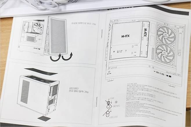 포장 박스에는 제품명과 함께 기본 디자인 및 간단한 특징을 살펴볼 수 있습니다. (엣지 라운드 디자인, 스틸 스타일, 탈부착 가능한 강화유리 커버, 식스 쿨링 팬 등) 구성품으로는 선 정리 케이블 및 고정 핀 그리고 나사가 들어있습니다. 메뉴얼은 심플하며 한눈에 보기 쉽도록 작성되어 있습니다.