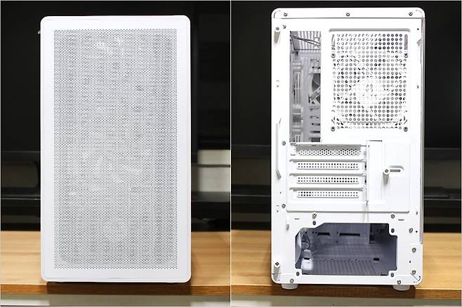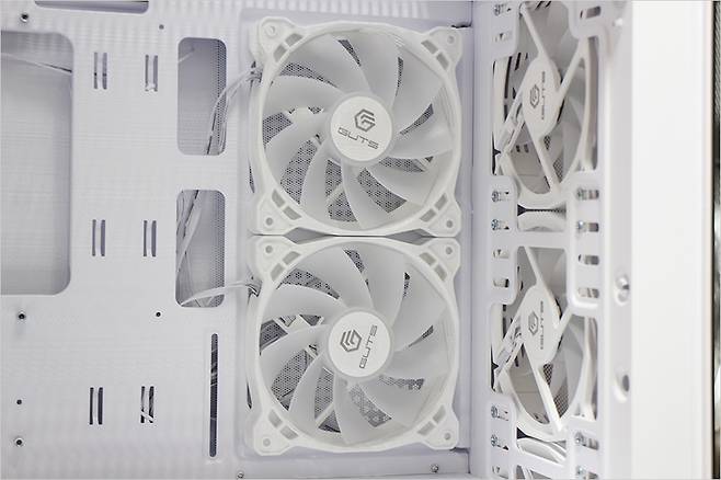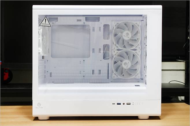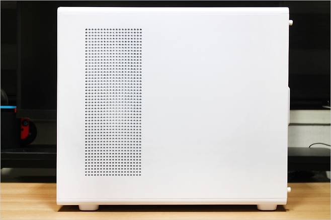 현대 화이트 및 블랙 모델이 출시되었으며 유저 입맛에 맞게 선택할 수 있습니다. 측면은 강화 유리 및 쿨러 배출 디자인을 확인할 수 있습니다. 보통 측면 쿨러는 동봉되어 있지 않은 경우가 많은데 식스팬 내장으로 추가 2개의 내부 측면 팬을 확인할 수 있습니다. 그리고 0.5T 스틸 재질을 사용해 좀 더 내구성을 높인것이 특징이며 보급형 타사 모델 대비 강도가 높은 편입니다.