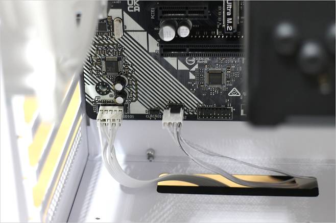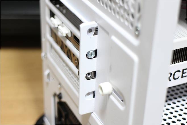 그래픽카드는 후면 가이드를 통해 안정적으로 설치가 가능하며, 하단부 공단이 넓기 때문에 파워 케이블들을 쉽게 넣어 깔끔하게 설치할 수 있습니다. 모듈러 파워라면 더욱 깔끔하게 선정리가 가능할 것 같습니다.
