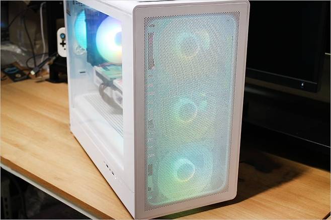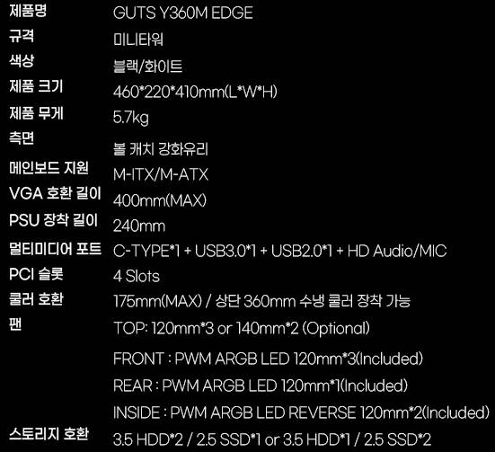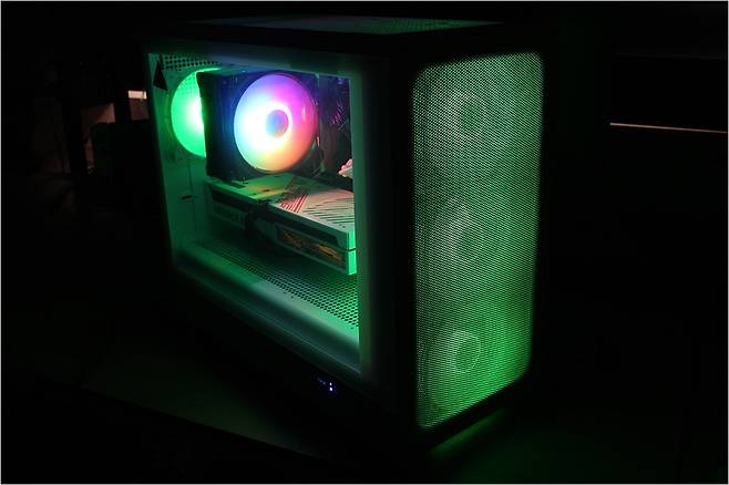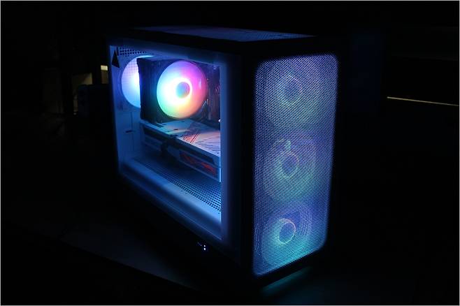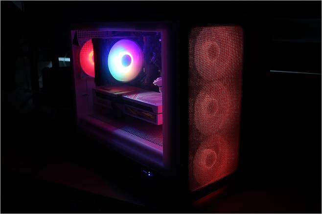 그리고 ARGB 쿨러들의 밝기도 상당한 편이라 야간에서 확실한 분위기를 낼 수 있으며 다양한 효과를 통해 색다른 연출이 가능합니다. 이처럼 몬스타 가츠 Y360M EDGE PC 케이스는 내장 ARGB 식스팬, 선정리에 용이한 챔버 설계, 하이엔드 시스템까지 커버가 가능한 내부 넓은 공간, 볼 캐치 방식의 강화유리의 편리 및 여러모로 디자인, 5만원대의 가성비, 편의성 잡은 미니케이스가 아닐까 생각됩니다. 중급 사양에도 알맞는 M-ATX 케이스로 생각되며 하이엔드 그래픽카드 설치도 간편한 만큼 깔끔하게 꾸미기에도 좋은 모델이라 생각됩니다.