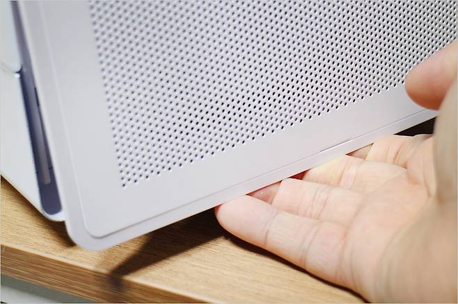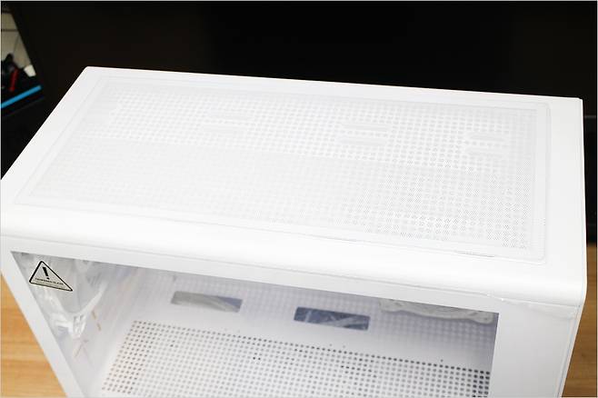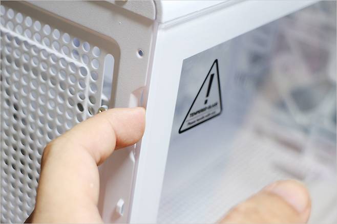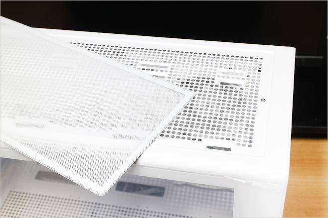 커버는 방식으로 쉽게 빼낼 수 있으며 쿨러 청소 및 케이블 정리를 쉽게 할 수 있는 구조입니다. 측면 강화유리의 경우 볼캐치 방식으로 탈부착이 매우 쉽습니다. 기존 여닫이 보다는 안정적인 느낌이 들었습니다. 뻑뻑하지도 않고 그렇다고 잘 빠지지도 않지만 약간 힘을 주면 쉽게 커버를 열 수 있습니다. 그리고 전면 메쉬가 있는 것과 없는것은 소음이나 쿨링 면에서 차이가 큰데 메쉬 기본 설계로 나은 쿨링을 기대할 수 있습니다.